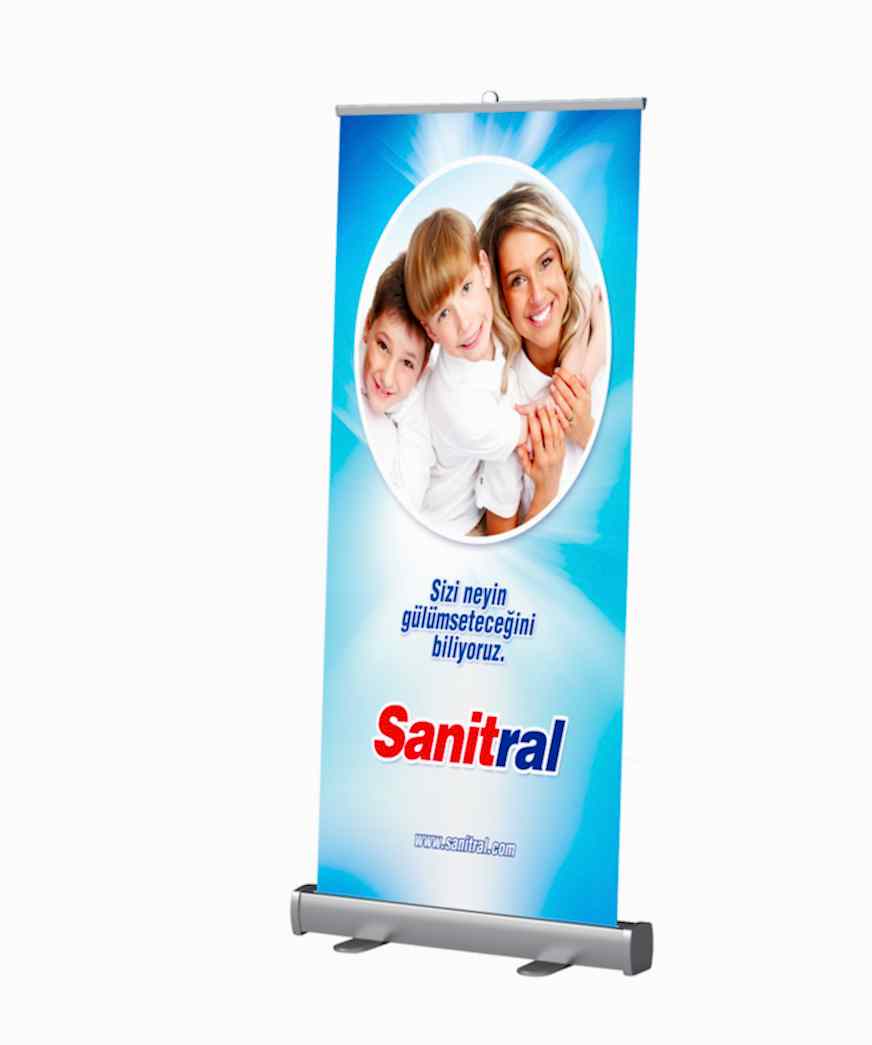 Roll Uplar’ın (roll banner) en çok tercih edilen ve kullanılanı ise, tamamı alüminyumdan mamul olan üstten sıkıştırmalı Roll up’dır . Oldukça hafif olan Roll up’lar her yere rahatlıkla taşınabilmesinden dolayı çok tercih edilmektedir. Roll Up (Roll Banner) otomatik mekanizmasından dolayı, baskıyı kendiliğinden içerisine sarar. Roll Uplar’ın üzerine vinly baskı veya kağıt baskı uygulaması yapılmaktadır.